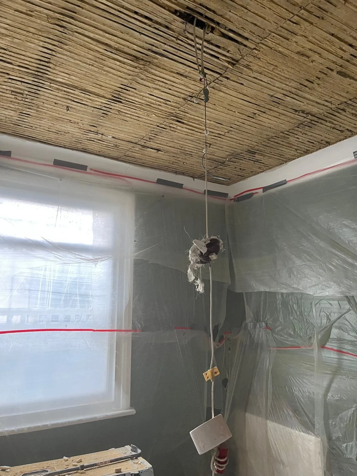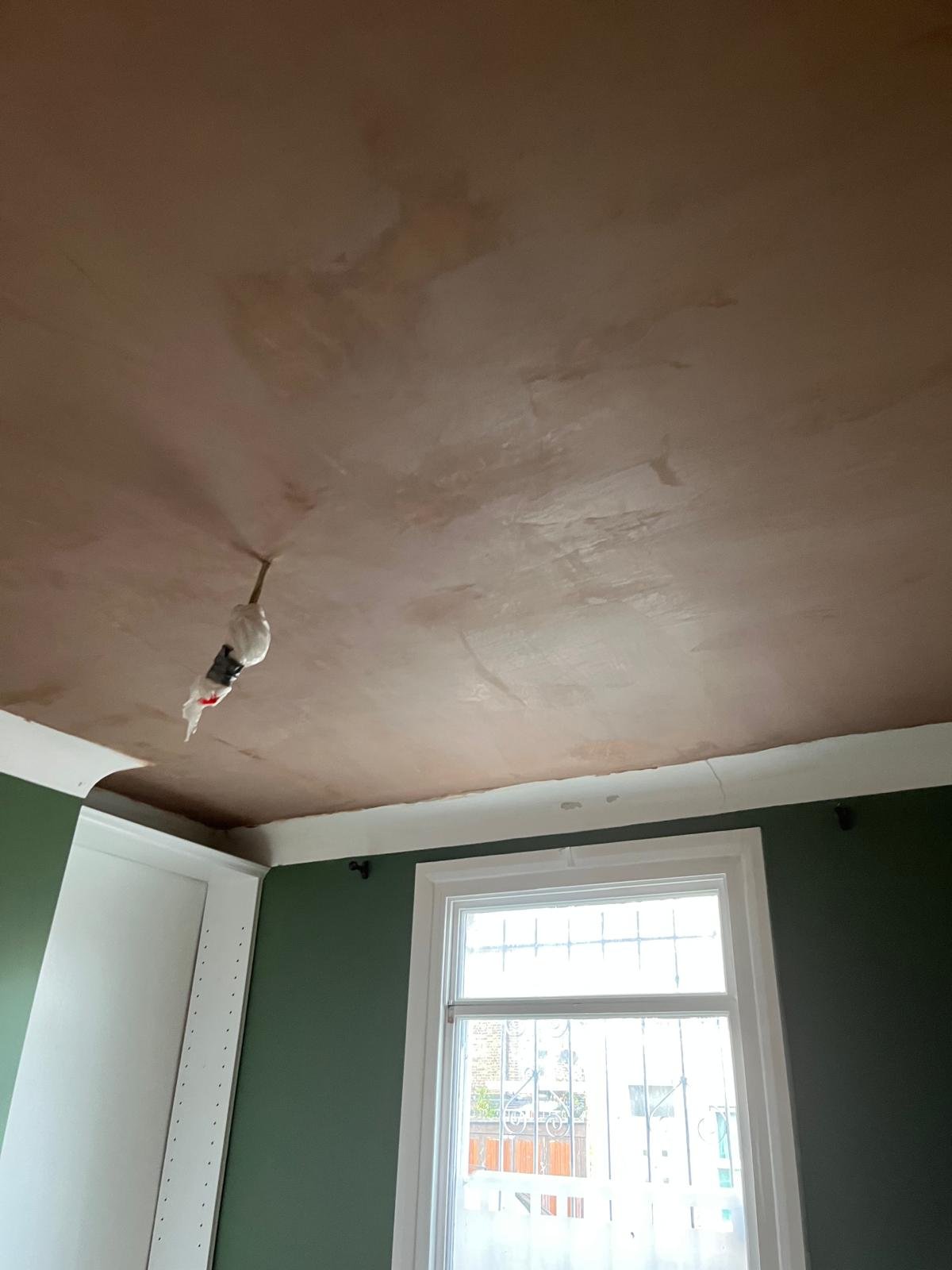 Defective ceiling stripped out, newly boarded and finished with a fresh skim coat.